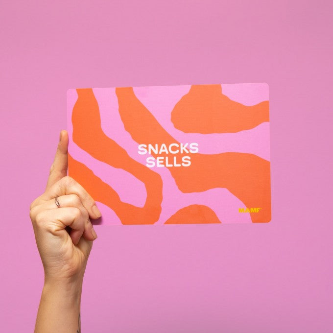 Alte Weisheit, der schon ganze Generationen von Bäckern und Köchen vertrauten: Wenn nix mehr geht: Snäcks Sells! Knalliger Farbkontrast aus dem Hause MAMF, der so wach macht wie Dein zweiter Kaffee.